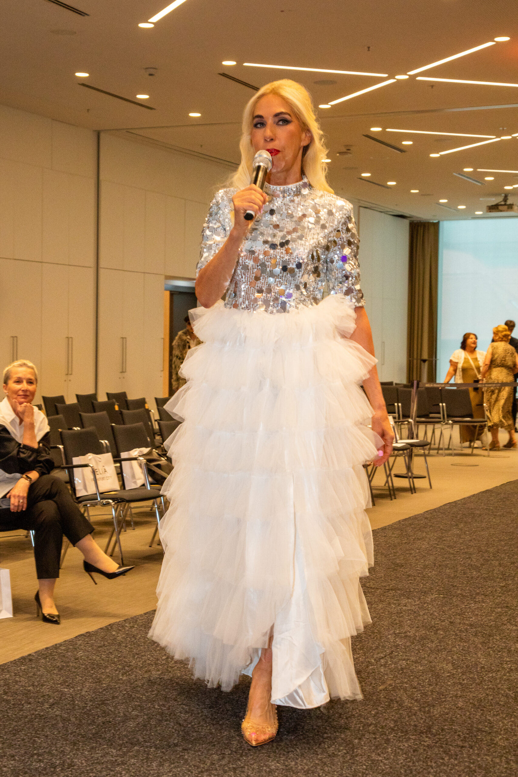 Melia Frankfurt City / Elora Fashion Show: Moderatorin Jane Uhlig führt emotioanl durch den Abend