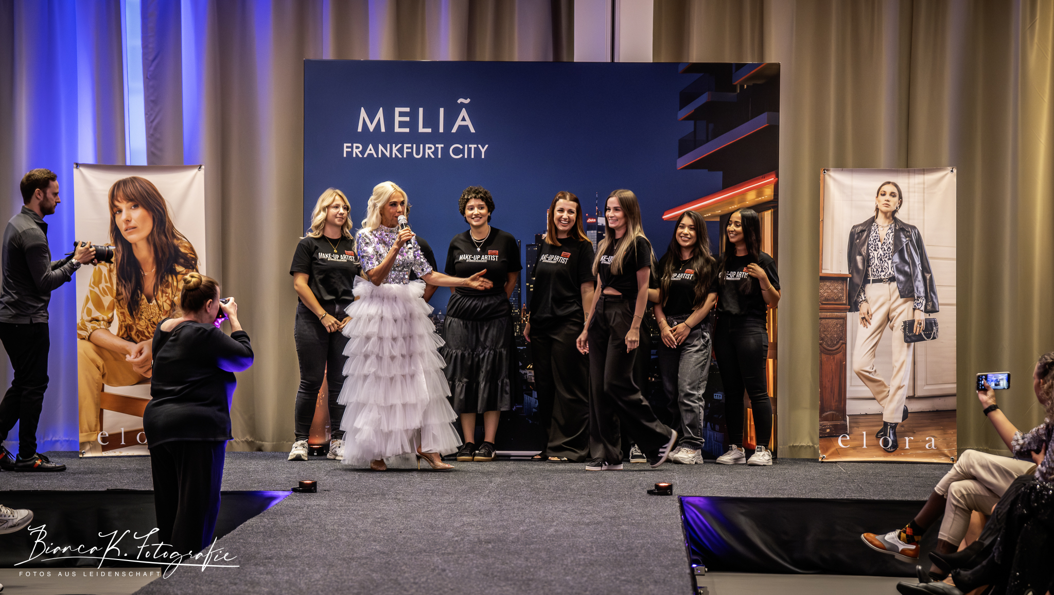 StartWie muss ein Model sein? ELORA Fashion Show im MELIÁ Frankfurt CityFamous Face Academy verschönerte die Models mit Brigit Bardot-Stil – Moderatorin Jane Uhlig stellte die Visagisten vor Copyright: Dirk Gier