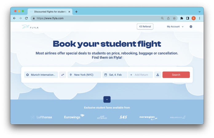 Flyla.com macht Studierendenflüge auffindbar, vergleichbar und buchbar. 2017 in München gegründet, bedient das Reiseportal mittlerweile hunderte von Strecken und mehr als 20 Airlines. Die Kooperationen bestehen mit namhaften Fluggesellschaften wie Eurowings, Turkish Airlines und SAS. Jeder gebuchte Flug wird automatisch klimakompensiert.