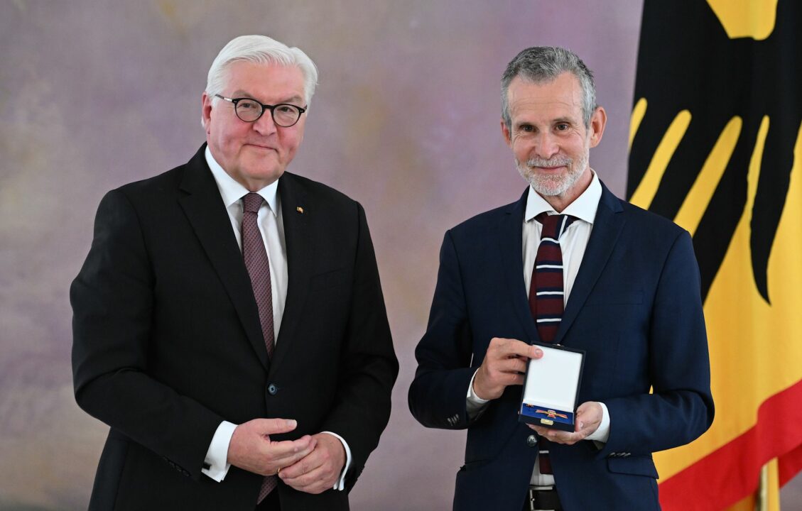 Bundespräsident Frank-Walter Steinmeier (l) neben dem Preisträger Ulrich Matthes.